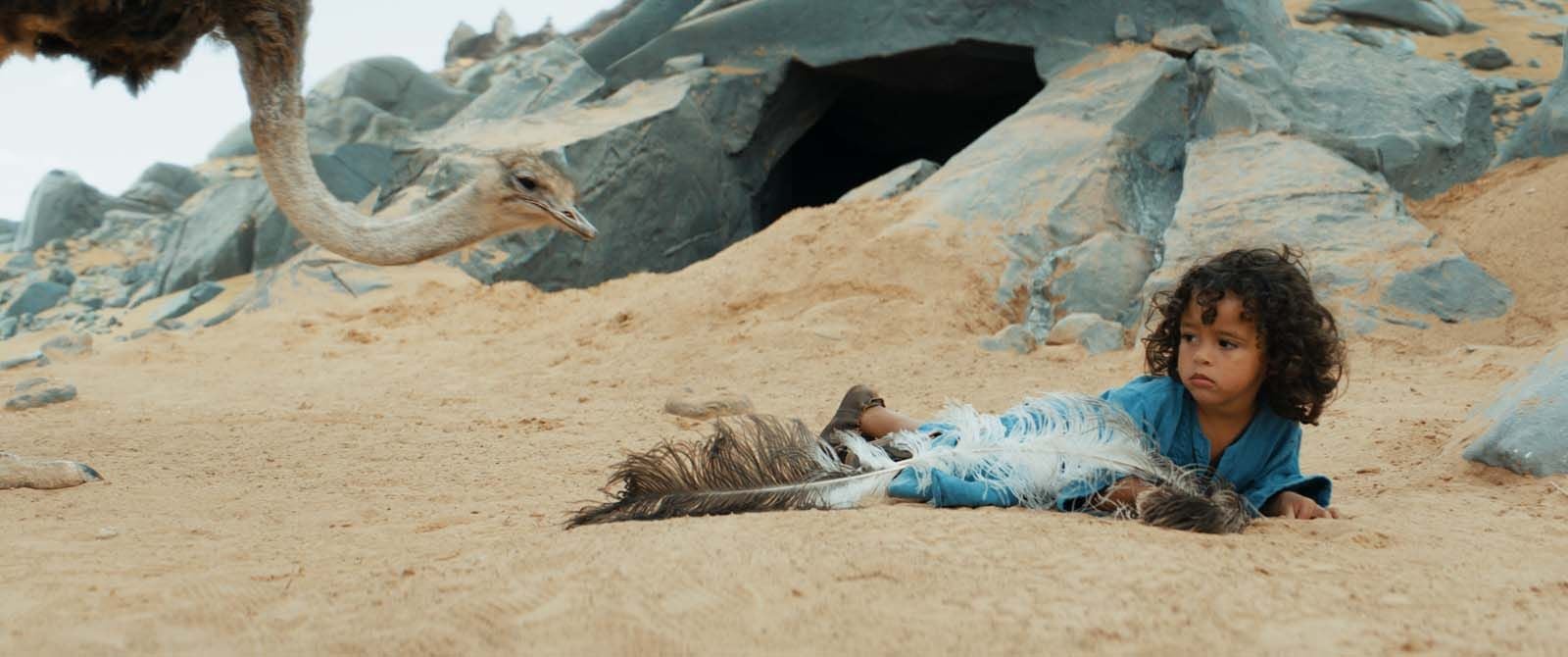 Tout commence par la publication par Sun, 14 ans, d’un livre inspiré d’une histoire que son grand-père lui racontait: celle d’Hadara, un enfant nomade perdu par sa famille à l’âge de 2 ans dans une tempête de sable dans le désert. L’enfant (Nahil Bouazzaoui) a été recueilli et protégé par des autruches, a fait ami-ami avec un petit fennec et a vécu ainsi jusqu’à ses 12 ans (Nahel Tran).