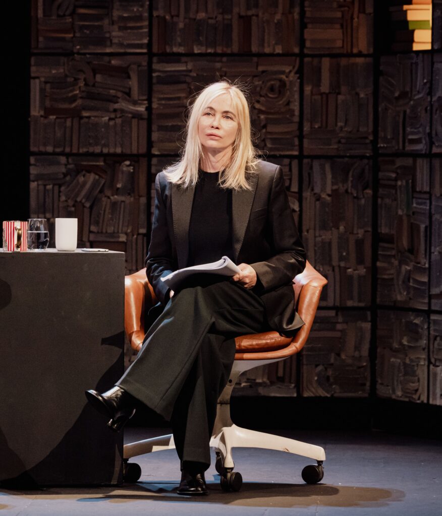En arrière-plan, une impressionnante construction de livres forme une sorte de tour vertigineuse, métaphore transparente mais efficace d’un savoir qui protège autant qu’il enferme. Durant une heure quinze, c’est là que se tient l’autrice retranchée dans la rigueur de sa pensée, tandis que la journaliste tente de la bousculer.