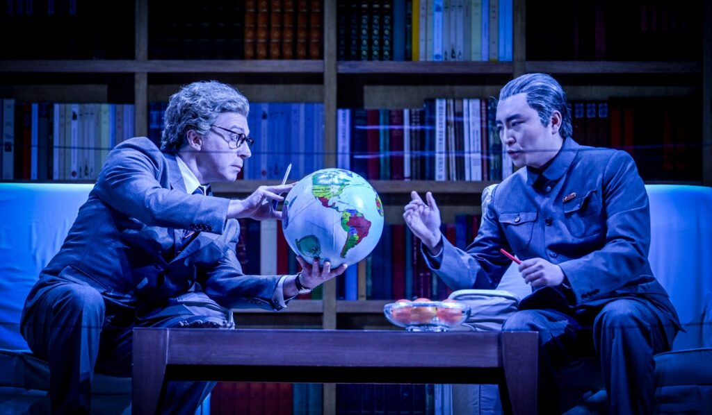 Toujours sur l’acte 1, lors de l’entretien entre Nixon et Mao, la scène se déploie verticalement : à l’étage, une bibliothèque solennelle chargée d’ouvrages ; en contrebas, un sous-sol où ouvrages brûlés et prisonniers torturés rappellent l’envers du décor idéologique et la violence du pouvoir.